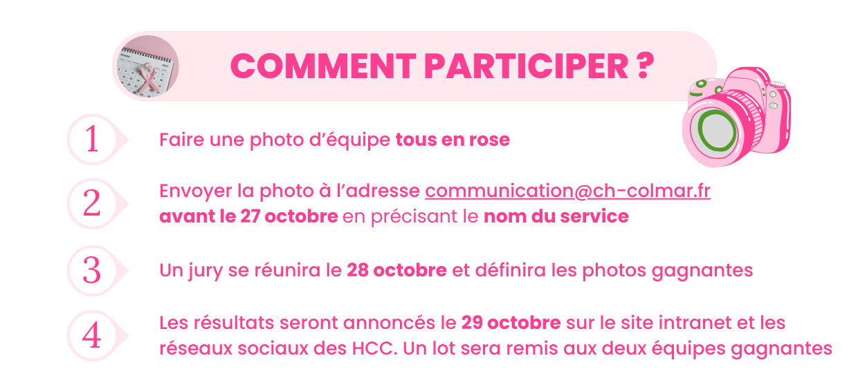 Pour participer : prendre une photo d’équipe tous en rose. Puis l’envoyer au service communication à l’adresse suivante : communication@ch-colmar.fr en précisant le service concerné. Vous avez jusqu’au 27 octobre pour envoyer votre photo ! Quelques goodies et accessoires sont disponibles au Secrétariat de Direction (bâtiment 28-2ème étage).